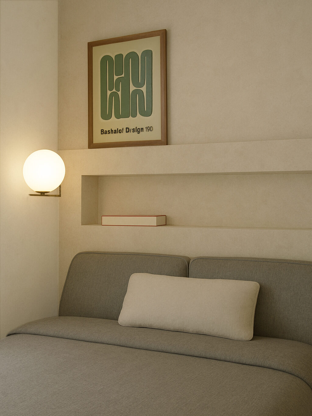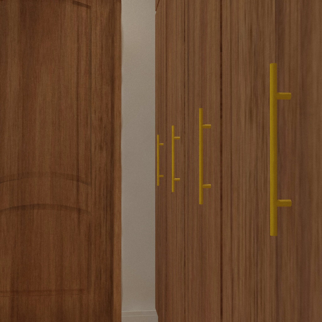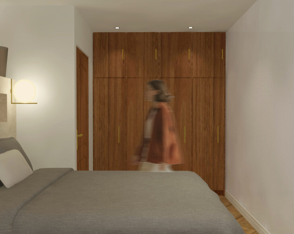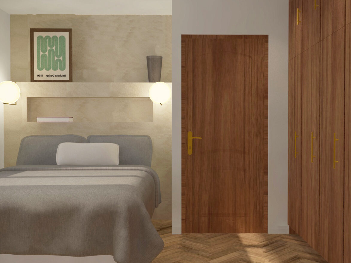 Une tête de lit intégrant une niche, accompagnée de deux appliques disposées de part et d’autre, apporte confort et praticité. Des meubles de rangement toute hauteur agrandissent visuellement la pièce et lui donnent du caractère.Enfin, des poignées en laiton brossé viennent souligner l’ensemble avec une touche d’élégance